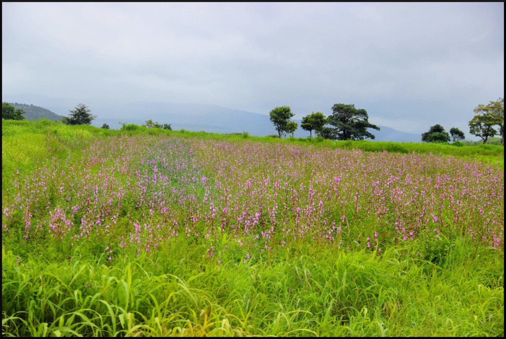 Me and Insha decided to climb up the stairs. It was a great experience walking in the milky white waterfall. We continued our journey, after spending sometime there. We couldn’t find any proper lunch place, as we were mostly on village roads, and survived on the parathas which we had packed from our stay in Goa. The rolling hills and the roads later on were very scenic, especially as it was monsoon, we could spot a few fields with pink flowers spread across like a carpet.